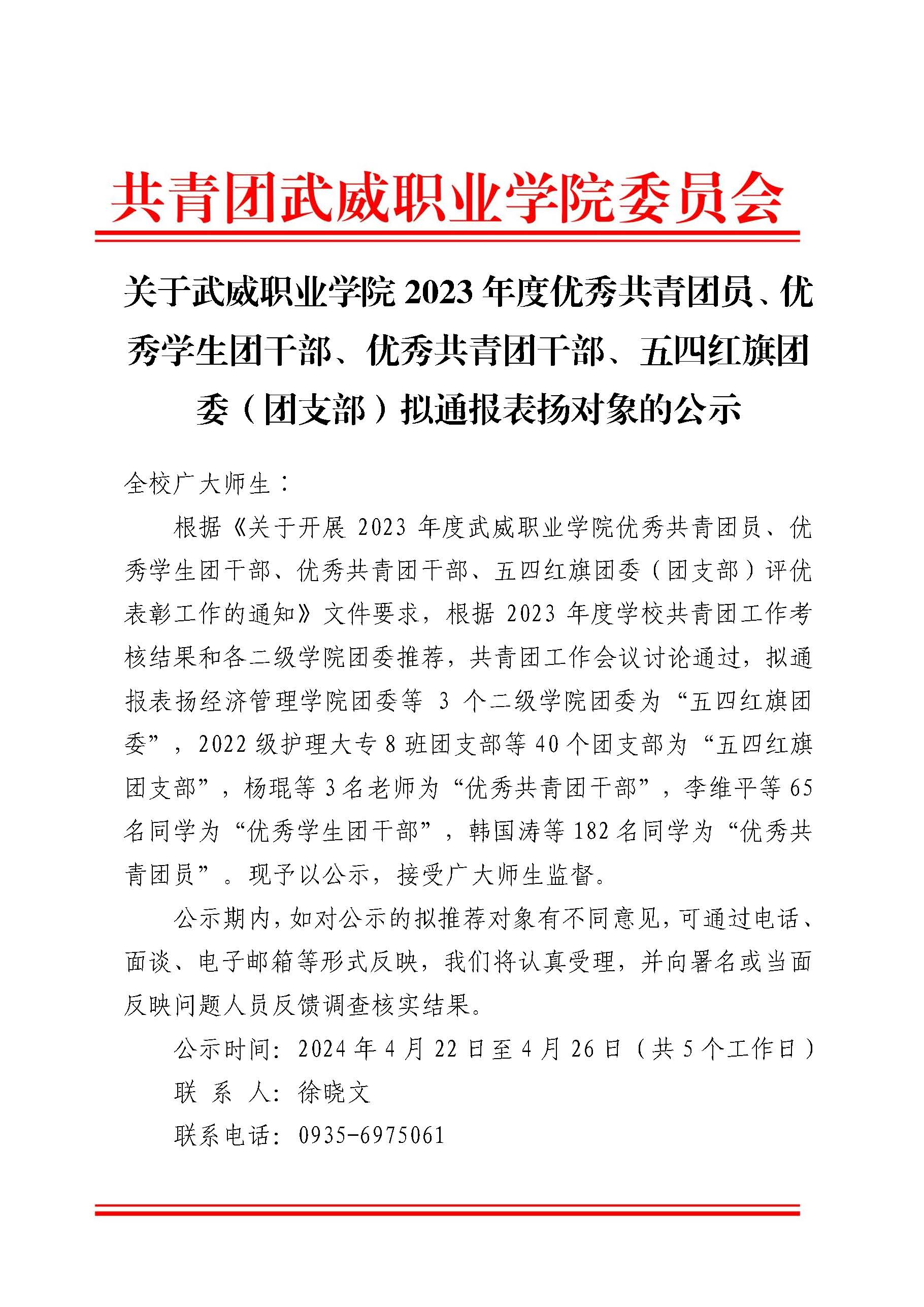 關(guān)于武威職業(yè)學(xué)院2023年度優(yōu)秀共青團(tuán)員、優(yōu)秀學(xué)生團(tuán)干部、優(yōu)秀共青團(tuán)干部、五四紅旗團(tuán)委(團(tuán)支部)擬通報(bào)表?yè)P(yáng)對(duì)象的公示