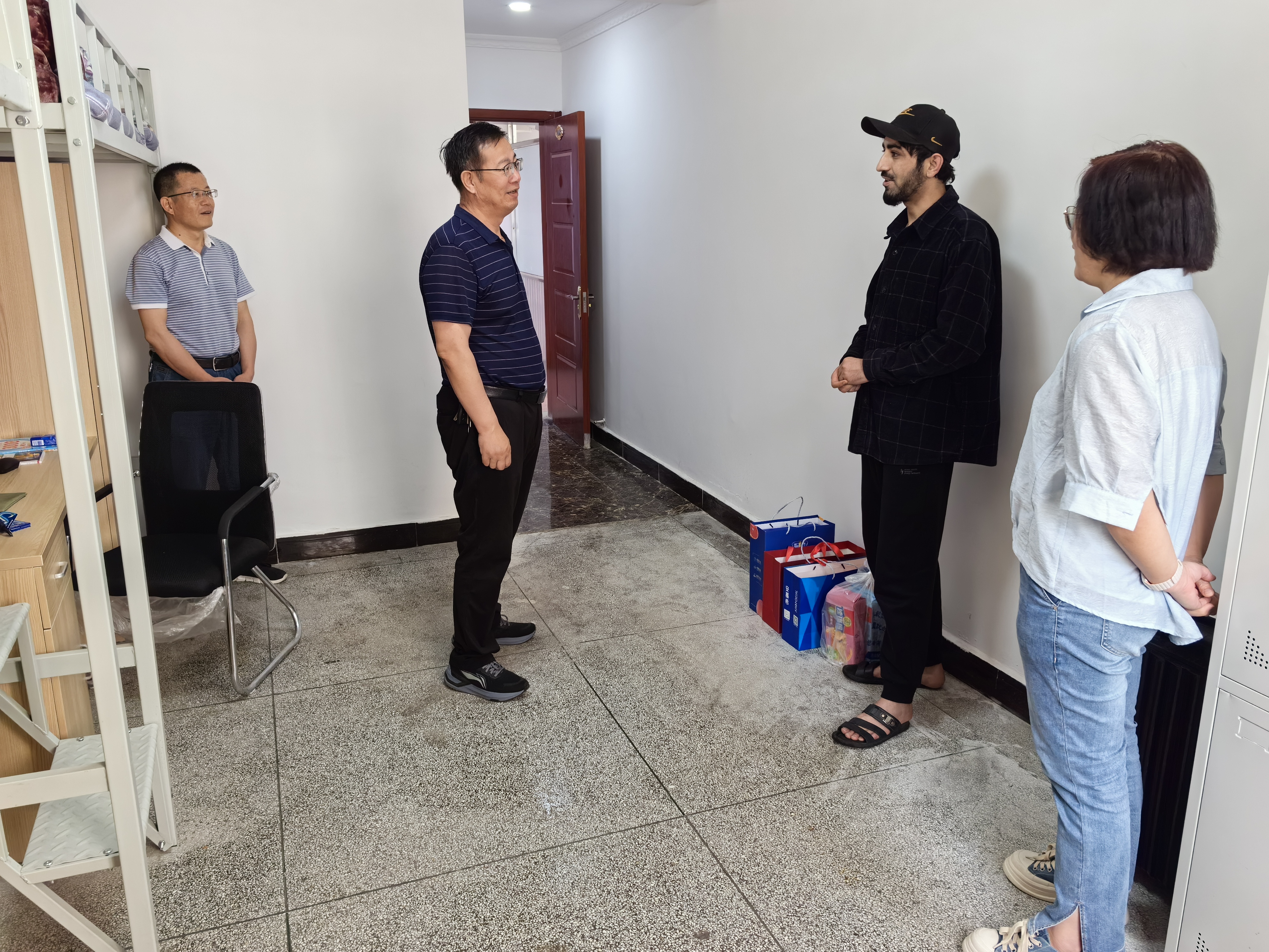 張開禮深入留學(xué)生宿舍、廚房,查看了解留學(xué)生住宿、生活情況,并代表學(xué)校黨委向留學(xué)生表達(dá)了節(jié)日的慰問和良好的祝愿,向留學(xué)生送上慰問品。在留學(xué)生公寓,張開禮與留學(xué)生親切交談,關(guān)切詢問留學(xué)生日常生活、專業(yè)學(xué)習(xí)、課程實(shí)訓(xùn)、畢業(yè)就業(yè)等情況。他鼓勵(lì)留學(xué)生們努力學(xué)習(xí),養(yǎng)成良好生活習(xí)慣,遵守公寓管理規(guī)則和安全條例,保持良好生活環(huán)境,同時(shí)也提醒留學(xué)生們端午節(jié)放假期間,不論是外出還是在校,都要注意安全,遵守法律法規(guī)和校紀(jì)校規(guī)。