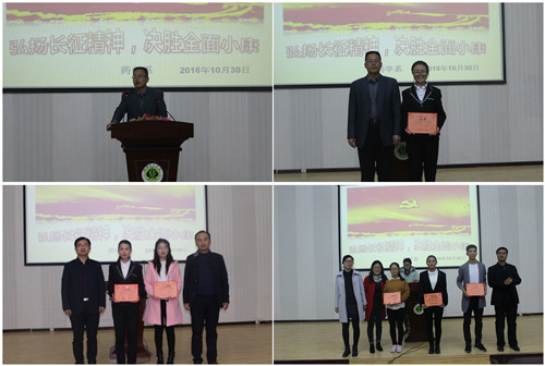 為紀(jì)念紅軍長征勝利80周年,激發(fā)師生弘揚(yáng)偉大的長征精神,同時(shí)為豐富校園文化生活,展示青春正能量,藥學(xué)系團(tuán)總支依據(jù)院團(tuán)委的通知精神和系團(tuán)學(xué)工作委員會(huì)關(guān)于增加學(xué)生課余活動(dòng)的會(huì)議要求,于10月30日在正德廳組織開展了“傳承長征精神,筑我青春夢(mèng)想”主題演講比賽。藥學(xué)系主任魏潤明出席了本次活動(dòng),各班班主任擔(dān)任本次比賽評(píng)委,2016級(jí)全體學(xué)生和2015級(jí)各班學(xué)生代表觀看了比賽。
