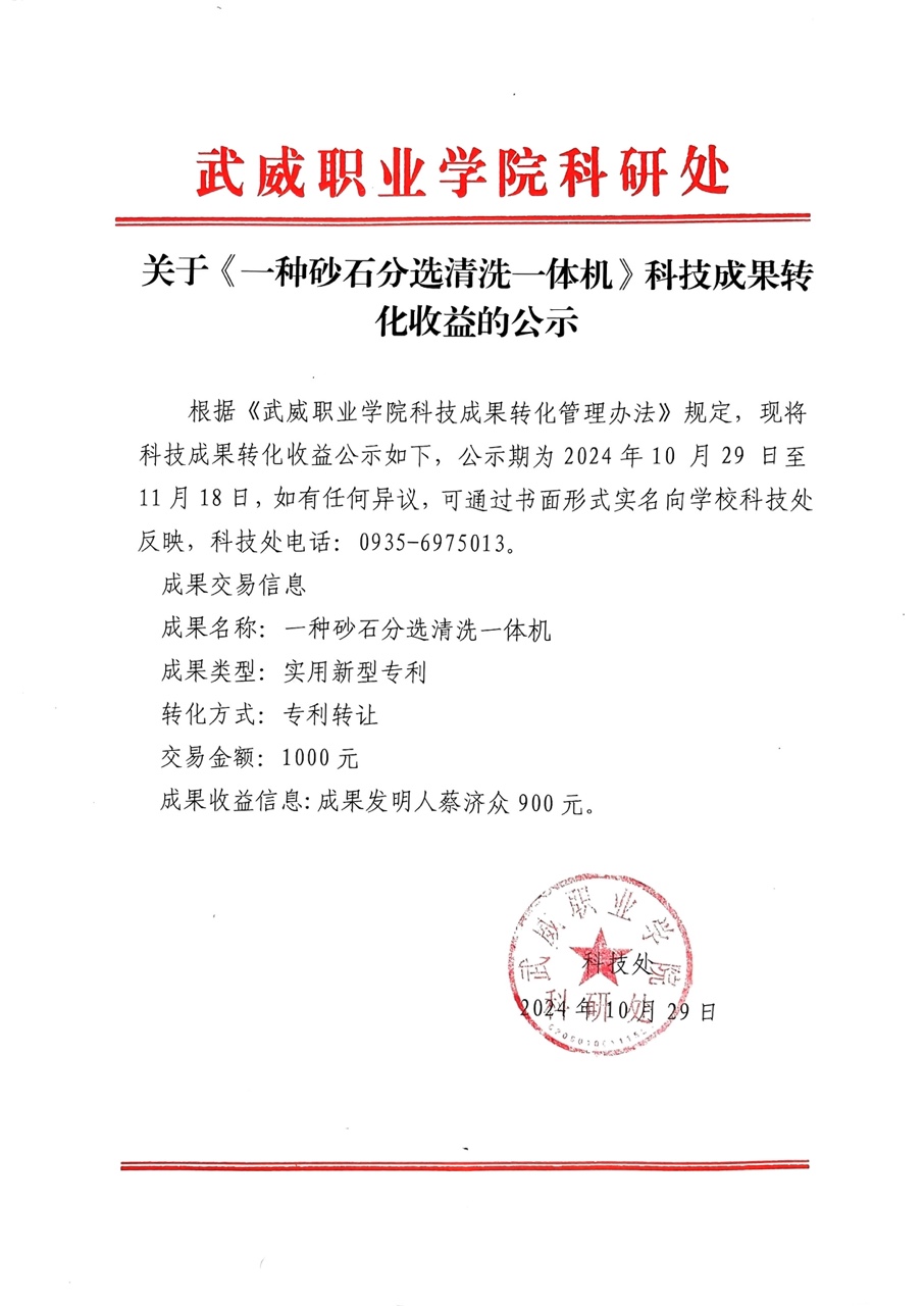 關(guān)于《一種砂石分選清洗一體機(jī)》科技成果轉(zhuǎn)化收益的公示