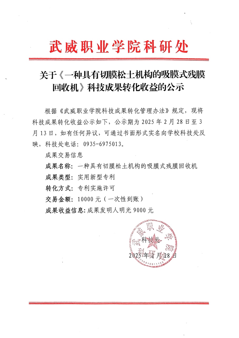關(guān)于《一種具有切膜松土機構(gòu)的吸膜式殘膜回收機》科技成果轉(zhuǎn)化收益的公示