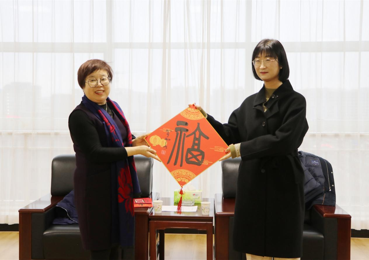 王宏對劉光美一行的到來表示歡迎,并詳細(xì)介紹了學(xué)校的辦學(xué)理念,辦學(xué)特色成果,教育改革創(chuàng)新和統(tǒng)戰(zhàn)工作情況等方面內(nèi)容。劉光美對學(xué)校一直以來支持民建組織各項(xiàng)工作表示感謝,并代表民建市委向張葦莉贈(zèng)送春聯(lián)并致以親切的問候和節(jié)日的祝福,同時(shí)勉勵(lì)其始終牢記教育初心,爭做師德高尚、潛心育人的好老師。