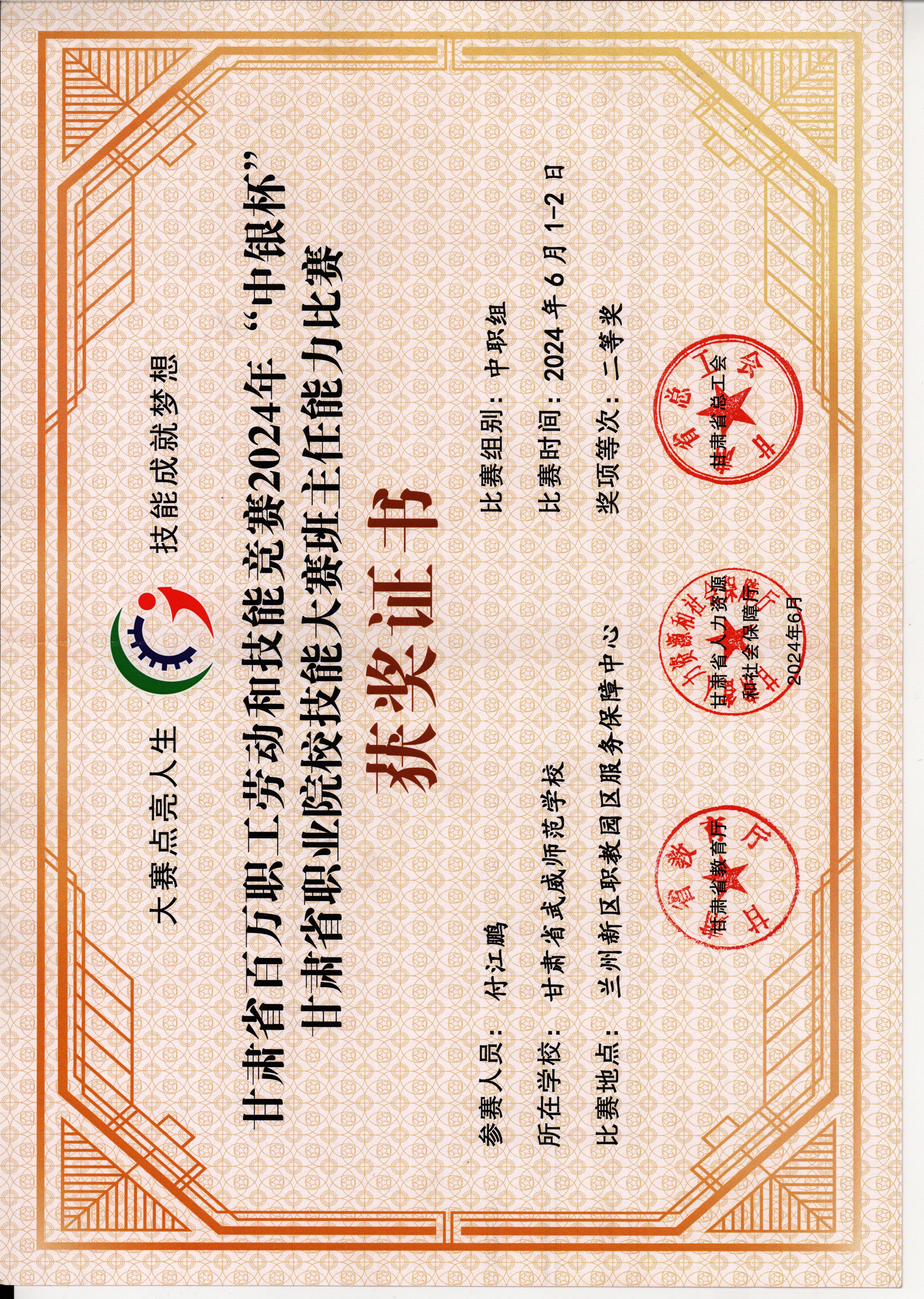 付江鵬 | 2024年甘肅省職業(yè)院校技能大賽班主任能力比賽 | 省級 | 二等 |