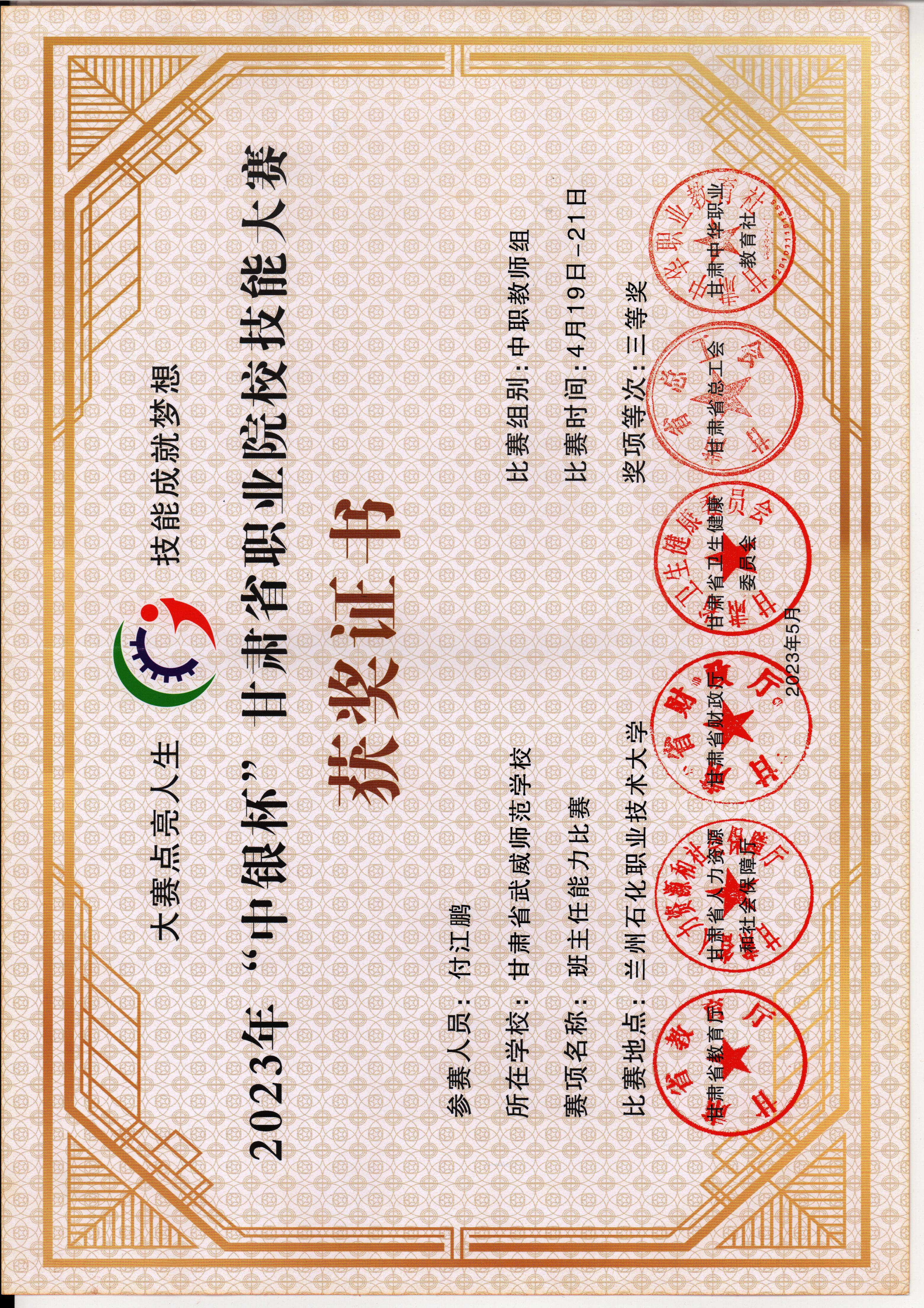 付江鵬 | 2023年甘肅省職業(yè)院校技能大賽班主任能力比賽 | 省級 | 三等 |