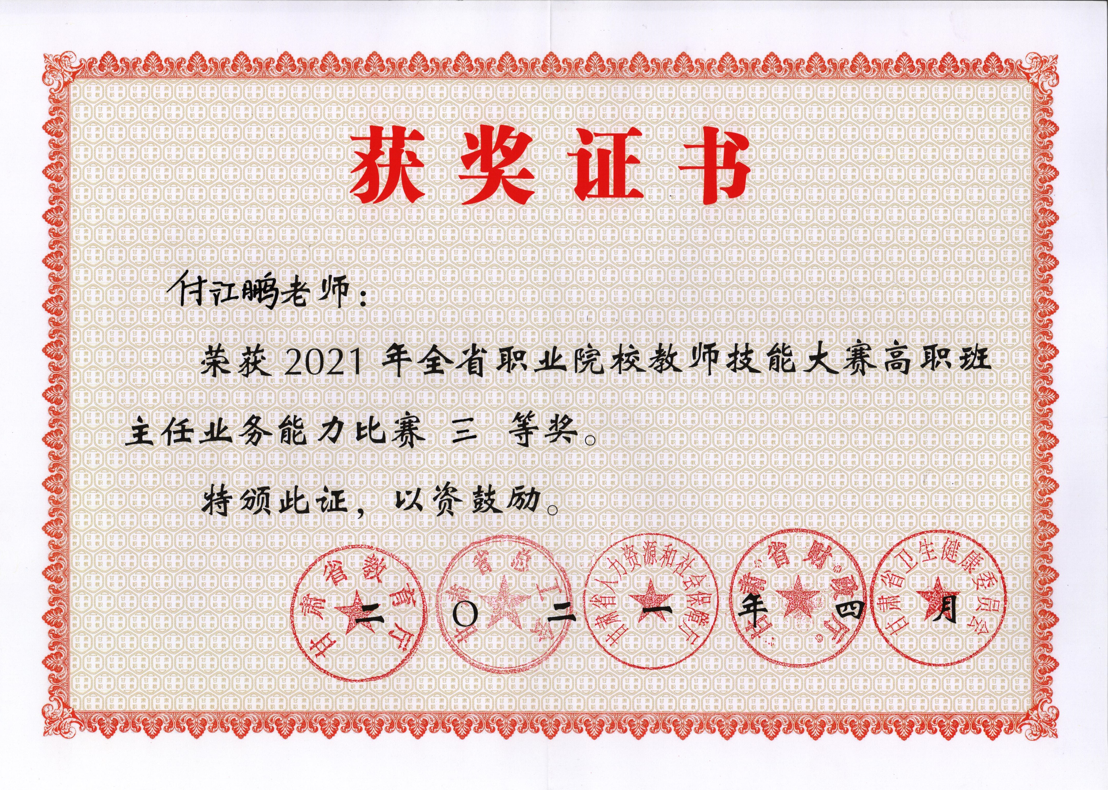 付江鵬 | 2021年甘肅省職業(yè)院校技能大賽班主任能力比賽 | 省級 | 三等 |