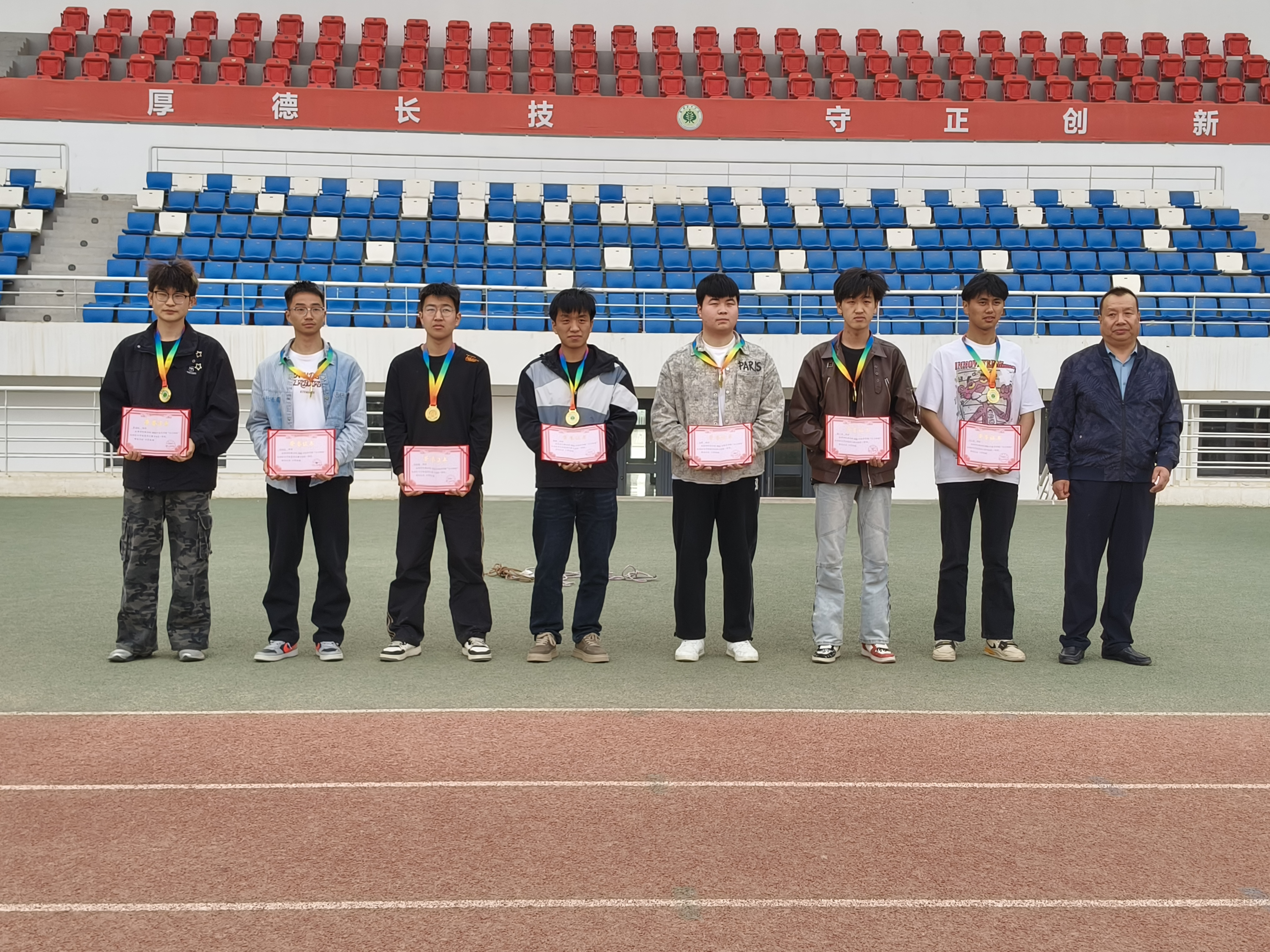 本屆運(yùn)動(dòng)會(huì)以“活力新程”為主題,創(chuàng)新設(shè)置五人四足、跳大繩、趣味接力等大競(jìng)賽單元。在壓軸進(jìn)行的競(jìng)技單元中,拔河決賽的吶喊聲震徹云霄,跳大繩的律動(dòng)劃破天際,趣味接力的歡笑此起彼伏。經(jīng)過激烈角逐,最終以2023級(jí)藥學(xué)大專1班為首的8個(gè)集體分獲各單項(xiàng)優(yōu)勝獎(jiǎng),本次運(yùn)動(dòng)會(huì)所有賽程圓滿結(jié)束。在莊嚴(yán)的頒獎(jiǎng)進(jìn)行曲中,蔡柱山書記、馬琪副院長(zhǎng)等領(lǐng)導(dǎo)依次為獲獎(jiǎng)團(tuán)體及個(gè)人頒發(fā)定制的“活力新程運(yùn)動(dòng)會(huì)優(yōu)秀運(yùn)動(dòng)員”主題獎(jiǎng)牌、榮譽(yù)證書。見證他們收獲榮耀的高光時(shí)刻。頒獎(jiǎng)結(jié)束后,由學(xué)生代表鄧海博上臺(tái)發(fā)言從他的分享中,我們感受到了同學(xué)們?yōu)榧w榮譽(yù)感積極拼搏,以及敢于挑戰(zhàn)、超越自我的昂揚(yáng)斗志。蔡柱山書記在閉幕致辭中強(qiáng)調(diào):“運(yùn)動(dòng)場(chǎng)上的每滴汗水都應(yīng)化作治學(xué)路上的恒久動(dòng)力,希望同學(xué)們將“永不言棄、協(xié)作共贏'的體育精神融入專業(yè)學(xué)習(xí),在未來(lái)的職業(yè)生涯中勇攀高峰”,最后鄭重宣布新程活力運(yùn)動(dòng)會(huì)圓滿舉辦。 ??