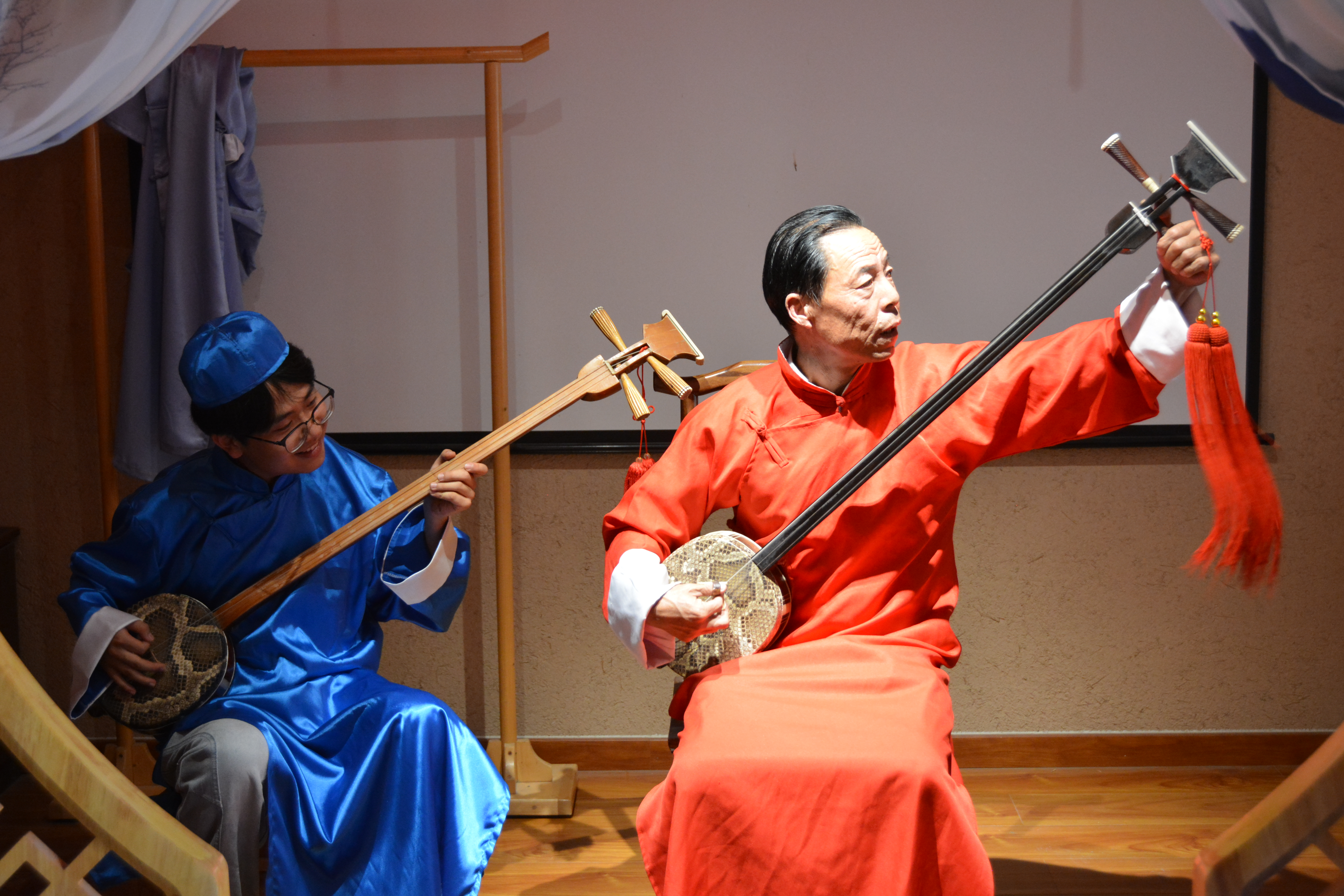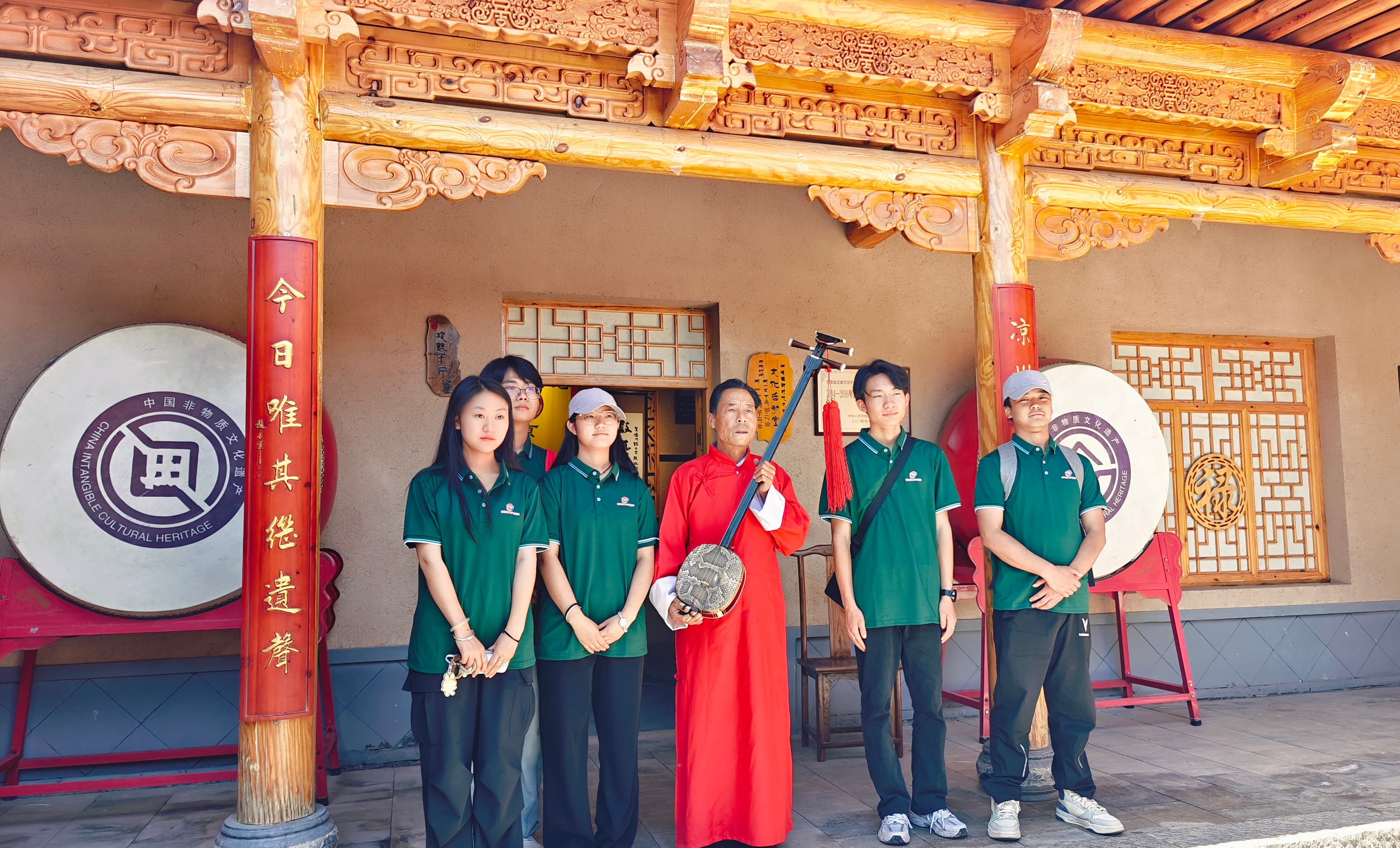非遺民俗文化館當(dāng)天化身成為一座流動的非遺課堂,實踐團(tuán)成員們圍坐在古樸的庭院中,聚精會神地聆聽當(dāng)?shù)刭Y深賢孝藝人董永虎老師深情演繹的經(jīng)典曲目。老藝人蒼勁而富有穿透力的嗓音,伴著三弦琴弦的顫動,將一段段蘊含忠孝節(jié)義、勸人向善的古老故事娓娓道來。那飽經(jīng)歲月洗禮的曲調(diào),仿佛穿越時空,在青磚黛瓦間回蕩,讓在場的每一位學(xué)子都深深沉浸其中,體味著這門古老說唱藝術(shù)所承載的歷史重量與人文溫度。