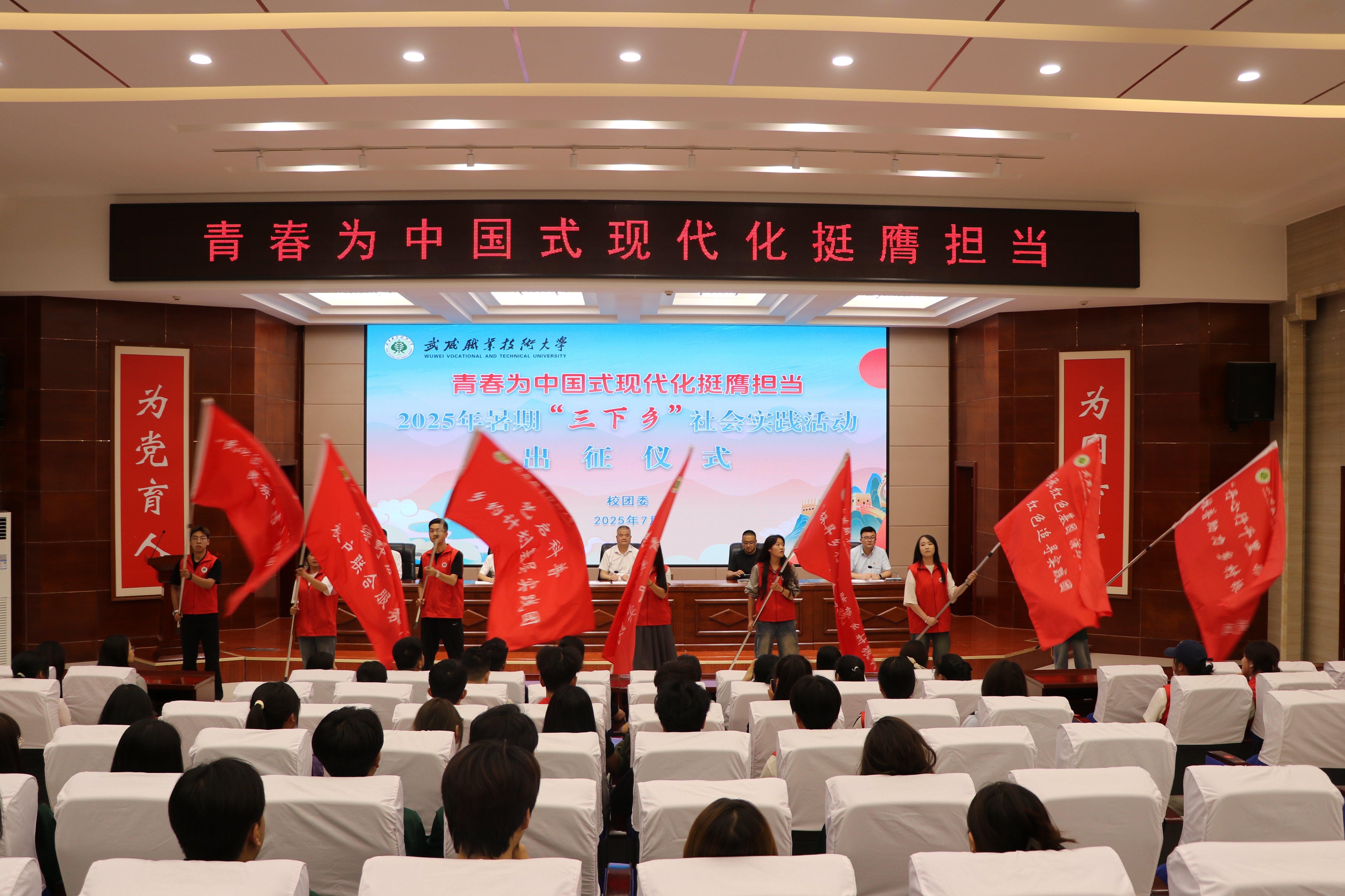 7月4日,武威職業(yè)技術大學2025年暑期 “三下鄉(xiāng)” 社會實踐活動出征儀式在學校菁英廳隆重舉行。黨委委員、副校長王守云出席并講話,學生工作部、宣傳統(tǒng)戰(zhàn)部負責人,校團委全體干部,二級學院團委書記、實踐隊員共100余人參加儀式。團委書記高鵬堂主持儀式。
