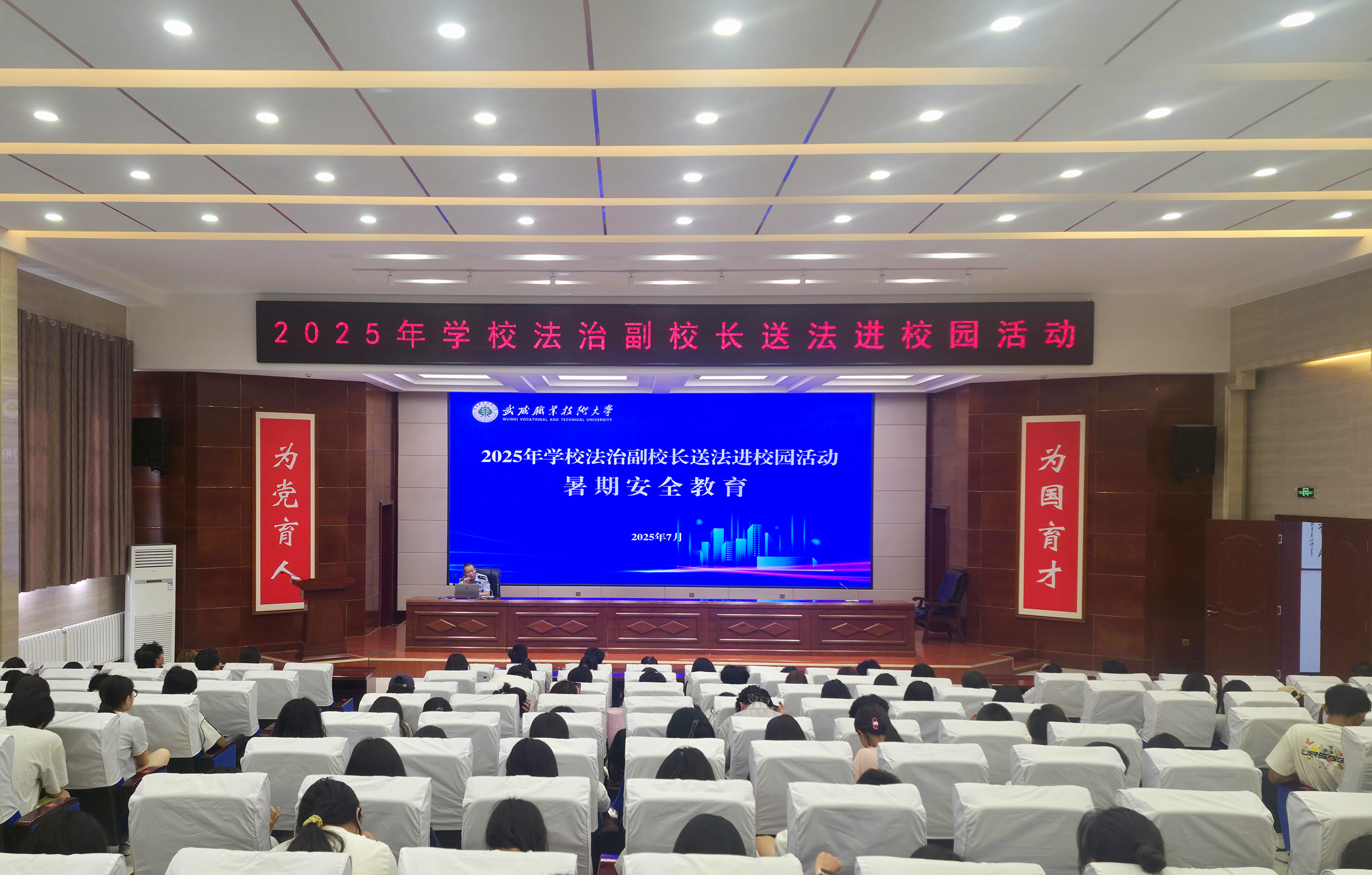 7月7日,學(xué)校法治副校長(zhǎng)進(jìn)校開展“送法進(jìn)校園”宣講活動(dòng),旨在進(jìn)一步提升師生安全防護(hù)與法治素養(yǎng),為暑期安全保駕護(hù)航。安全保衛(wèi)處、學(xué)生工作部負(fù)責(zé)同志及各學(xué)院輔導(dǎo)員、學(xué)生代表共200余人參加活動(dòng)。?