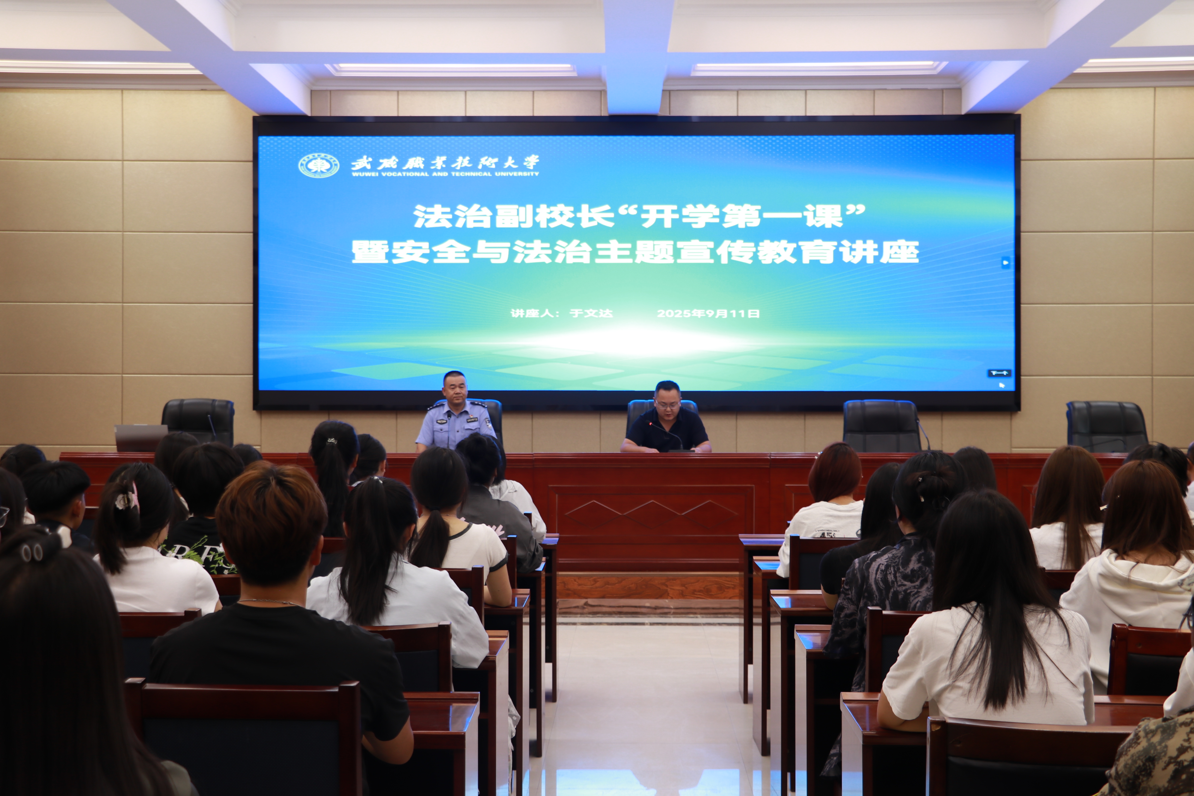 為加強師生法治觀念,提高安全意識,9月11日,學校安全保衛(wèi)處邀請法治副校長于文達為學校師生講授2025年秋季學期“開學第一課”,開展安全與法治教育專題講座?;顒釉谛袠錁潜眰葓蟾鎻d舉行,活動由安全保衛(wèi)處副處長康興奎主持。
