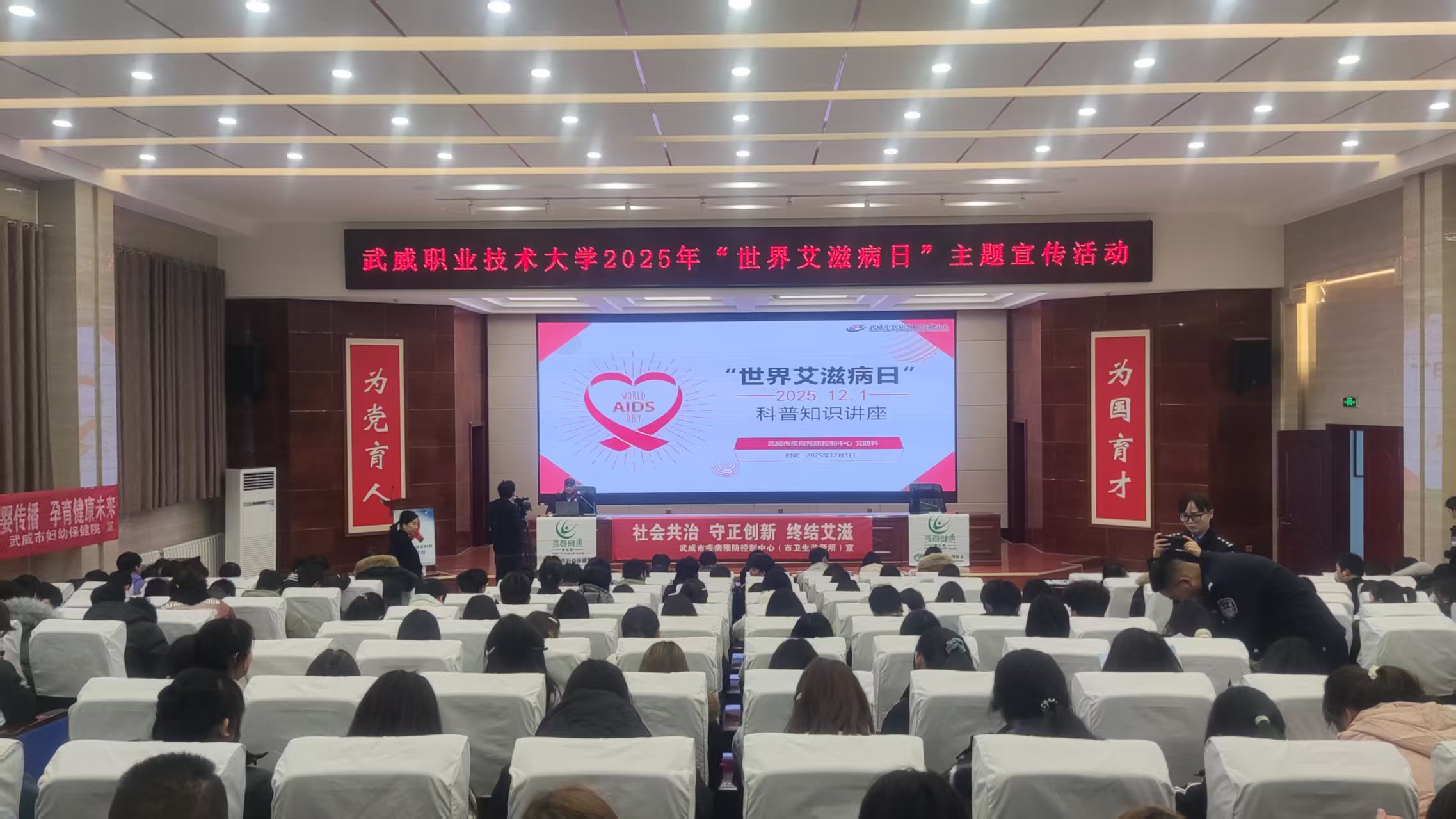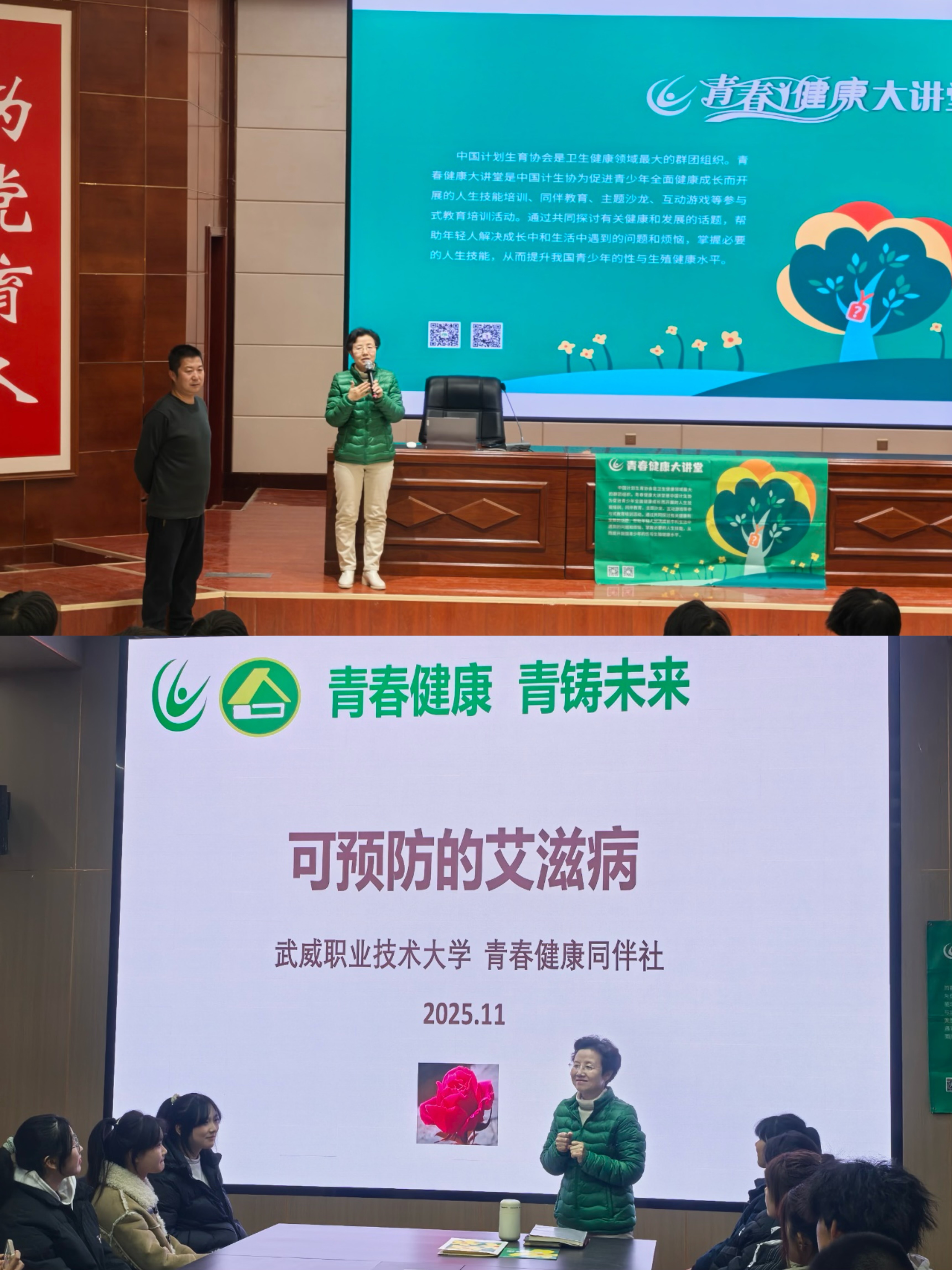 當天的主題宣傳活動內(nèi)容豐富,形式多樣?;顒右潦迹爸腊睂n}講座在菁英廳率先開講。講座特邀武威市疾病預防控制中心艾防科負責人王向尚與武威市人民醫(yī)院的皮膚科副主任醫(yī)師李杉擔任主講嘉賓。專家們結合一線工作實際經(jīng)驗,用翔實的數(shù)據(jù)和鮮活的案例,生動講解了艾滋病的傳播途徑、預防措施、流行現(xiàn)狀以及反歧視理念,內(nèi)容深入淺出,貼近學生實際,有效幫助大家樹立起正確的防艾觀念,消除對艾滋病感染者的誤解與恐懼。