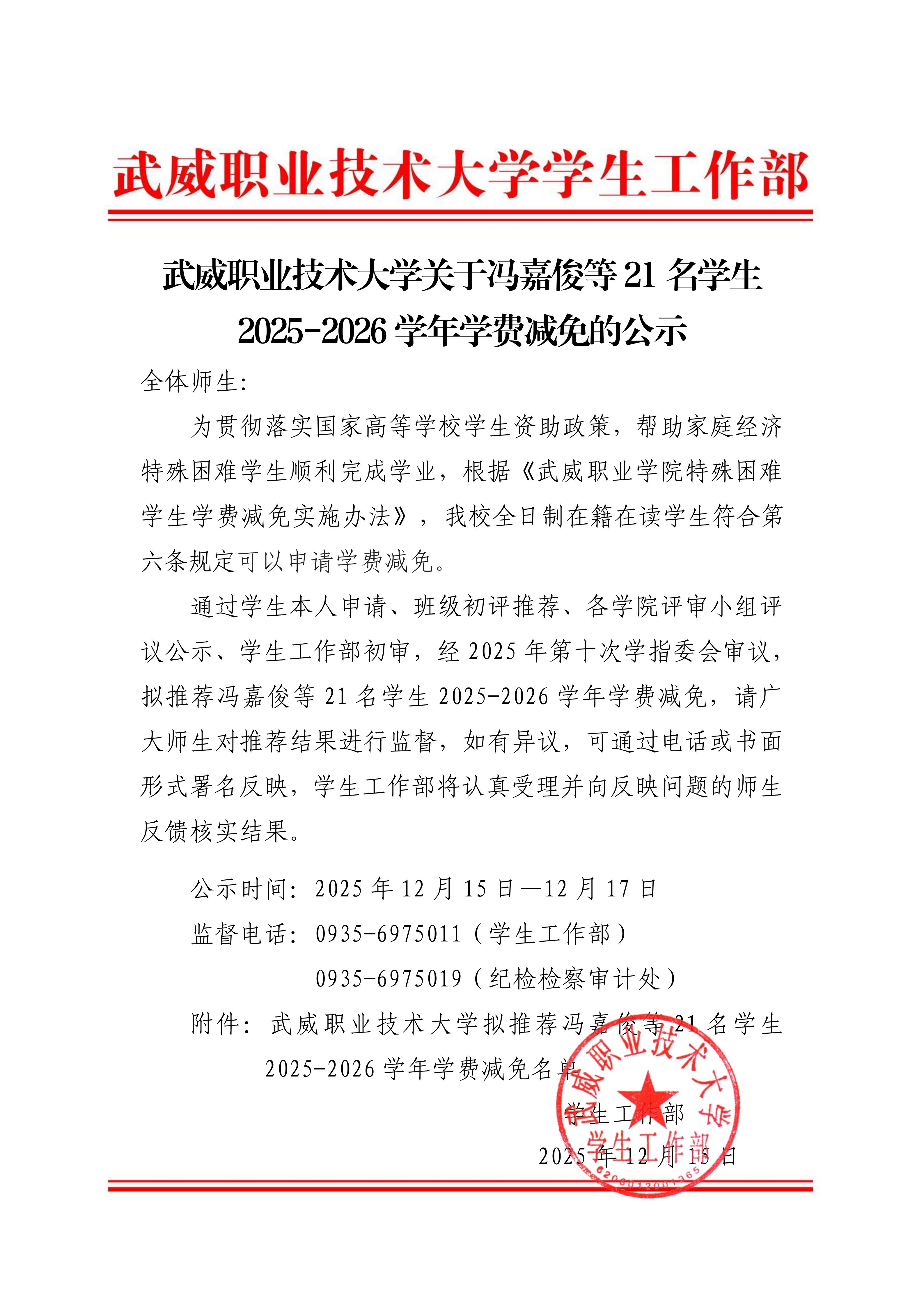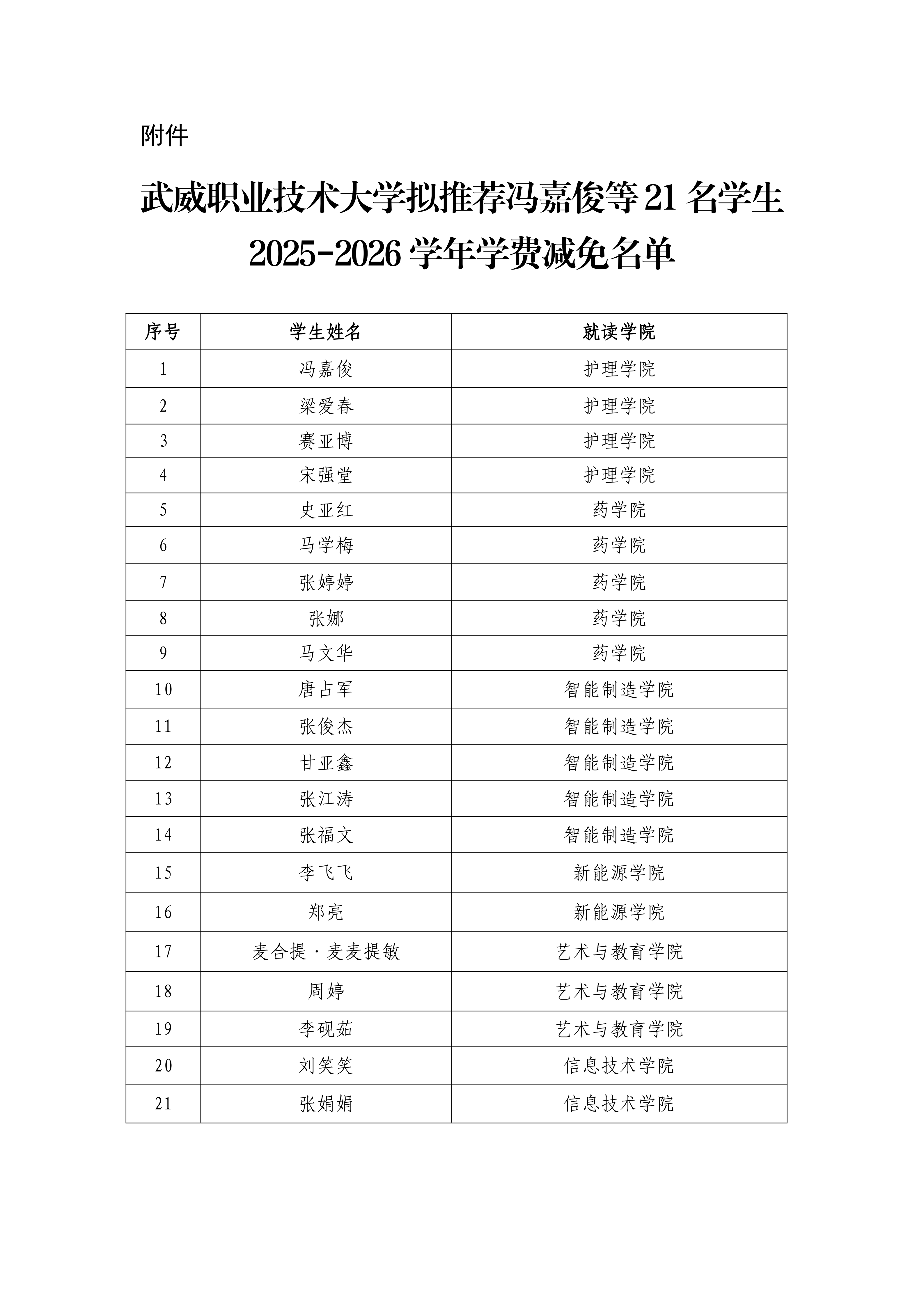 武威職業(yè)技術(shù)大學(xué)關(guān)于馮嘉俊等21名學(xué)生2025-2026學(xué)年學(xué)費減免的公示