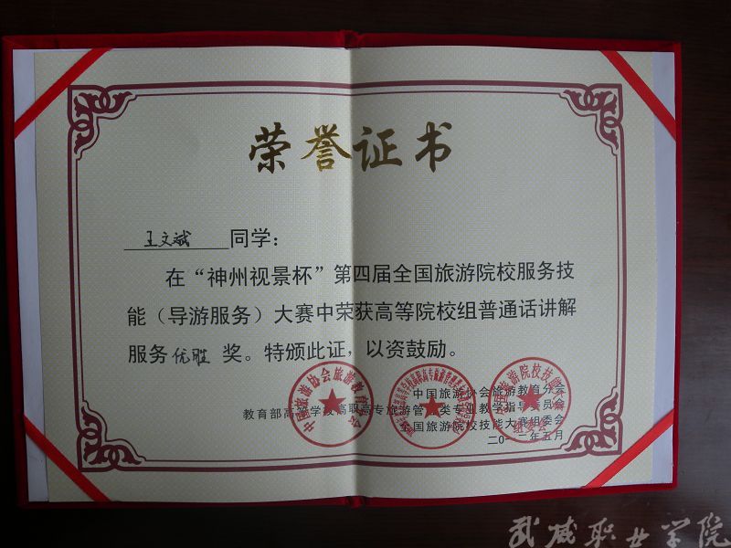 經(jīng)濟(jì)管理系晉藝波老師指導(dǎo)我系旅游管理、酒店管理專業(yè)學(xué)生參加2012年“神州視景杯”第四屆全國(guó)旅游院校服務(wù)技能(導(dǎo)游技能)大賽,榮獲優(yōu)秀獎(jiǎng)。