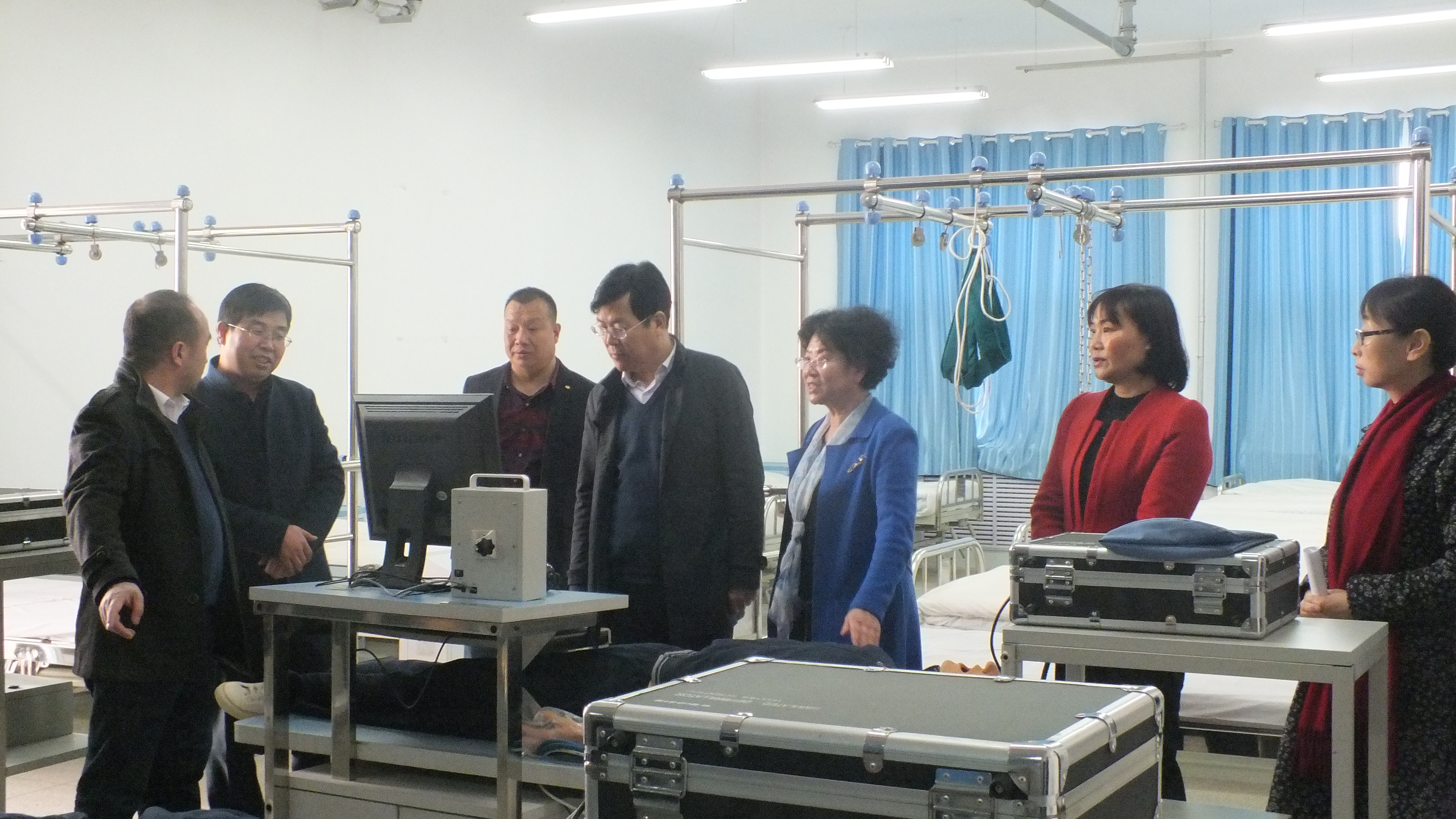 毛校長一行參觀了護理系的生命科技館、機能實訓室、基護實訓室、內(nèi)外科實訓室等醫(yī)學類實訓室,詳細了解了實驗設備的運行情況和實驗實訓課程的教學管理模式。潘玉華向來賓們介紹了學院申辦臨床醫(yī)學專業(yè)的進展,以及我院實訓課程建設和籌建實驗實訓室取得的成果。