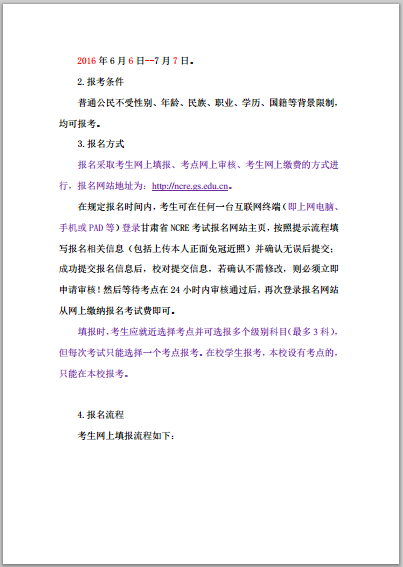 根據(jù)甘肅省教育考試院《關(guān)于做好2016年9月全國(guó)計(jì)算機(jī)等級(jí)考試網(wǎng)上報(bào)名工作的通知》(甘教考院〔2016〕95號(hào)文件)要求,2016年9月全國(guó)計(jì)算機(jī)等級(jí)考試(NCRE)將于2016年6月6日開(kāi)始報(bào)名,全省統(tǒng)一實(shí)行網(wǎng)上報(bào)名。本次報(bào)名按照考生網(wǎng)上填報(bào)、考點(diǎn)網(wǎng)上審核、考生網(wǎng)上繳費(fèi)的步驟進(jìn)行。現(xiàn)將有關(guān)安排及要求通知如下: