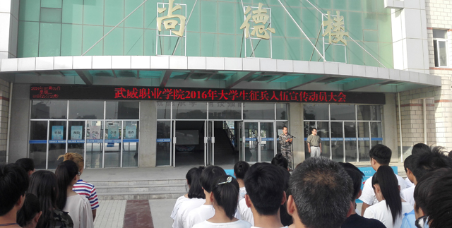 2016年7月5日早晨,學(xué)生工作處聯(lián)合院團(tuán)委在學(xué)院尚德樓北廣場(chǎng)舉行了“武威職業(yè)學(xué)院2016年大學(xué)生應(yīng)征入伍宣傳動(dòng)員大會(huì)”。學(xué)院1000多名學(xué)生和各系輔導(dǎo)員參加了大會(huì),學(xué)院武裝部部長(zhǎng)王守云主持動(dòng)員大會(huì)。