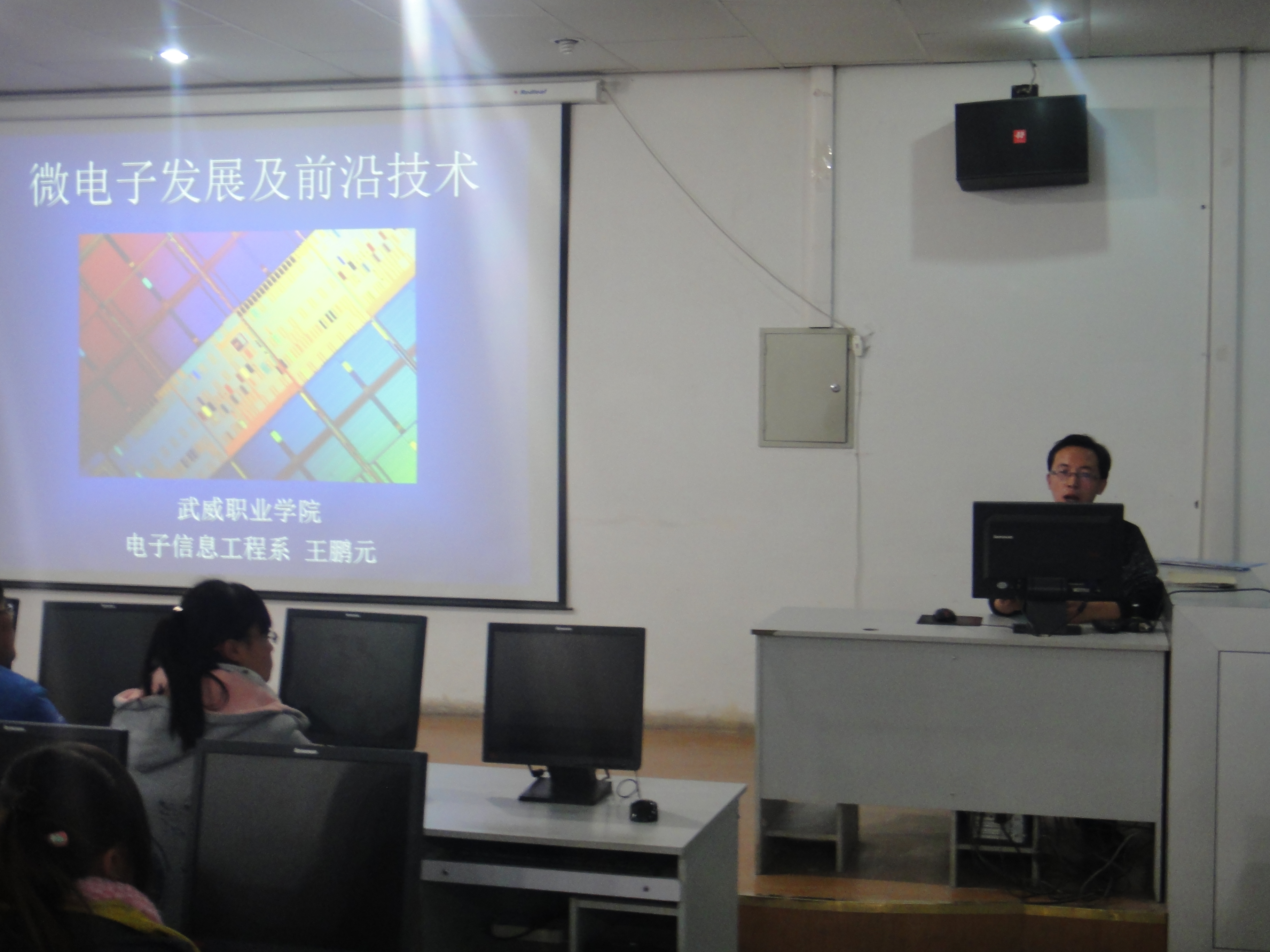 王老師以世界電子發(fā)展歷史為背景,先后講解了微電子發(fā)展及前沿技術、集成電路應用60年、晶體管的發(fā)明、世界上第一臺計算機的誕生及發(fā)展、多核微處理器、微電子技術的主要發(fā)展方向、集成電路制造工藝、新器件與新材料、集成電路走向系統(tǒng)芯片、集成電路的發(fā)展史、MEMS技術和生物信息技術將成為下一代半導體主流技術等內容;之后又結合自身經歷在不斷地發(fā)問中引導同學們思考,簡單介紹了電源電路、基本元器件的識別,示波器等測量儀器的使用。