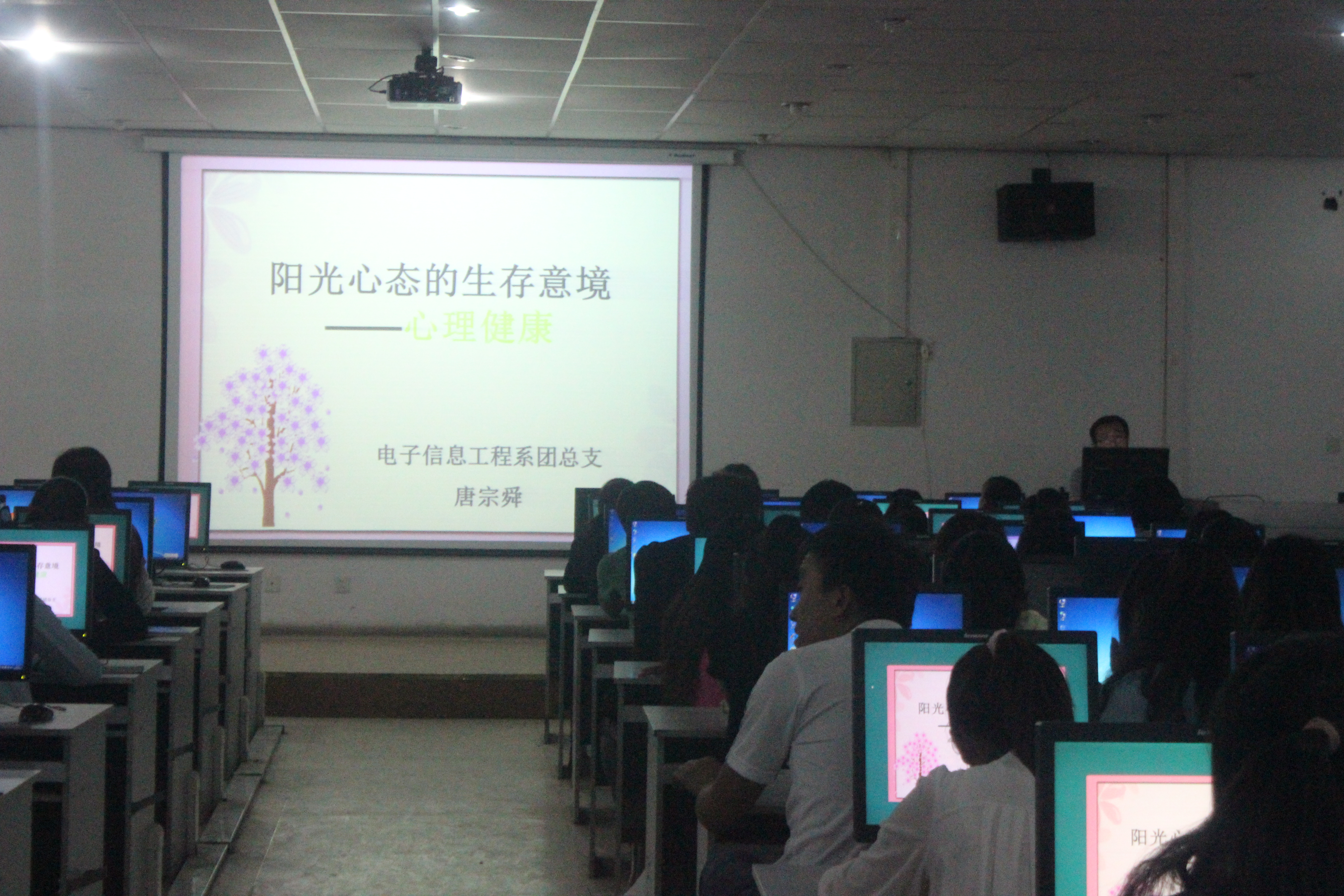 為了進(jìn)一步推進(jìn)大學(xué)生心理健康教育宣傳工作深入開展,在學(xué)生中營造一種學(xué)習(xí)、普及、宣傳心理健康知識(shí),關(guān)心、理解、幫助有心理困擾的同學(xué),共同創(chuàng)造良好氛圍,促進(jìn)大學(xué)生健康成長(zhǎng),以適應(yīng)新時(shí)代、新環(huán)境需要。5月26日晚8時(shí),電子信息工程系在學(xué)院十號(hào)機(jī)房舉辦心理健康教育專題講座。