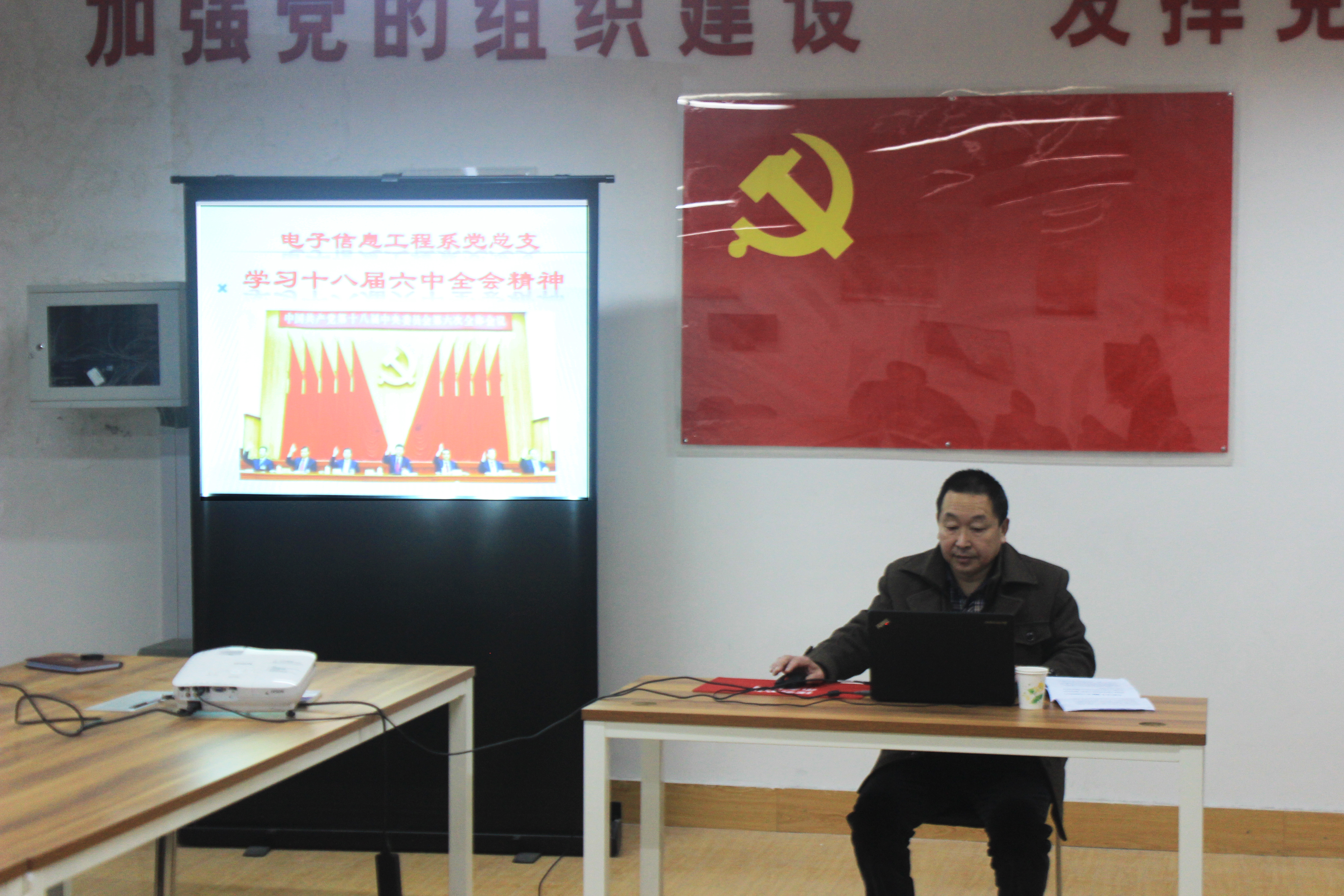 為認真學習領會黨的十八屆六中全會重要精神,全面加強我系黨的建設,更好地推動我系各項工作開展,按照學院《關于開展十八屆六中全會精神宣講的通知》要求,電子信息工程系于1月4日邀請人文藝術教育系劉心副教授進行了十八屆六中全會精神宣講。會議由系黨總支書記袁青年同志主持,全體教師及學生入黨積極分子參加了宣講會。