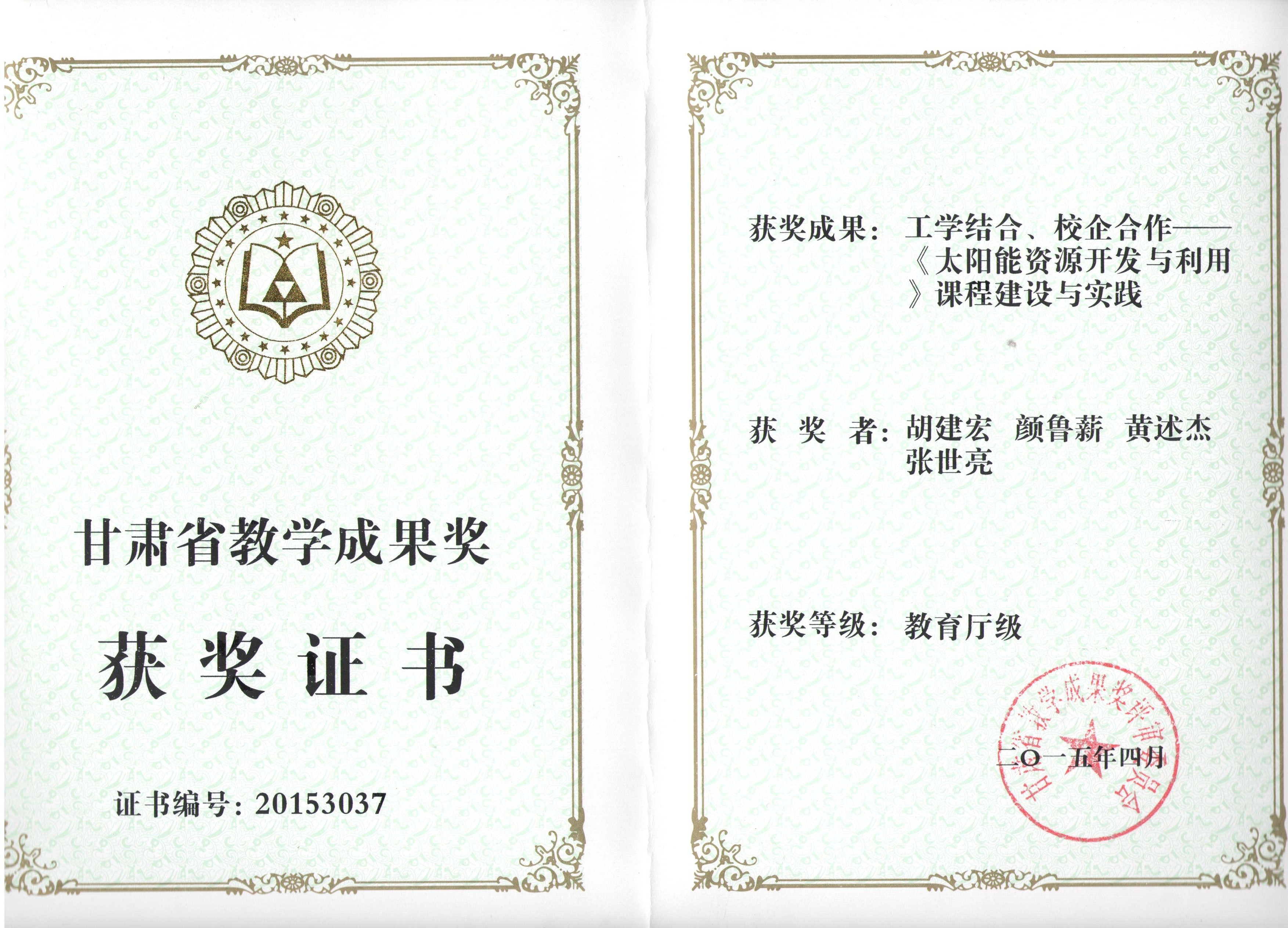 《太陽能資源開發(fā)與利用》課程建設與實踐榮獲甘肅省教學成果獎