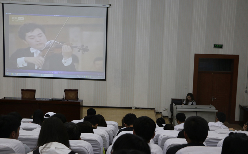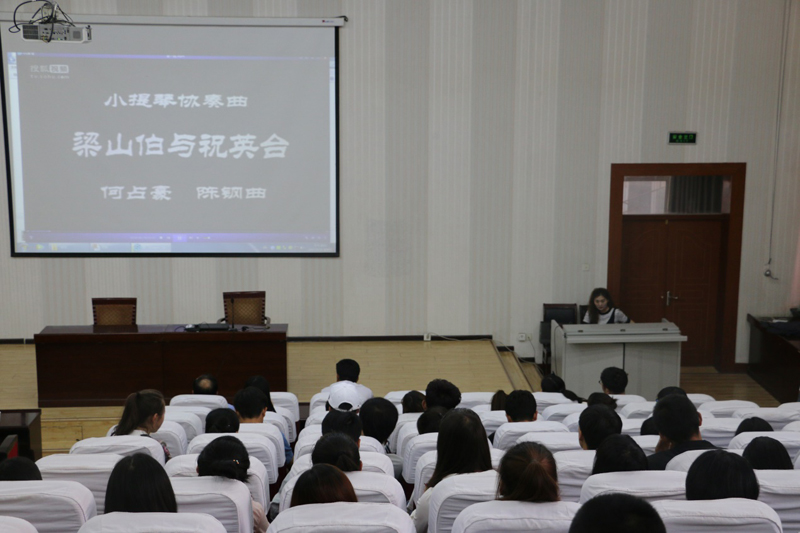 伴著優(yōu)美的音樂旋律王敏副教授開始了講座,王老師首先介紹了音樂發(fā)展歷史和音樂鑒賞的基礎(chǔ)知識,然后以我國著名作曲家陳鋼、何占豪先生創(chuàng)作的小提琴協(xié)奏曲《梁山伯與祝英臺》為題材,分階段講述了“鳥語花香”、“草橋結(jié)拜”、“英臺抗婚”、“投墳化蝶”等內(nèi)容和藝術(shù)場景。剖析了作品在管樂、和以小提琴、大提琴為主的弦樂及民樂有機結(jié)合的高超藝術(shù)境界,講座過程中王老師結(jié)合《梁?!穮f(xié)奏曲音視頻資料,演繹了梁山伯與祝英臺凄美的愛情故事。