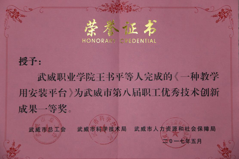 為貫徹落實武威市委、市政府關于《武威市十萬職工職業(yè)技能素質提升活動工作方案(2016-2020年)》(武政辦發(fā)〔2016〕72號)文件精神,推動我市“雙創(chuàng)”工作的深入開展,激發(fā)我市廣大企事業(yè)職工提升技能和開拓創(chuàng)新的熱情。近日,由市總工會、市人社局、市科技局等單位聯(lián)合舉辦了“武威市第八屆職工技術創(chuàng)新成果評選活動”。本屆職工技術創(chuàng)新成果評選共征集創(chuàng)新成果87項,其中:學院推薦了十項研究課題、專利技術項目,王書平團隊《一種教學用安裝平臺》項目成果榮獲一等獎,申賓德團隊《簡易焊工考試用帶坡口鋼板火焰切割下料機的研究與應用》,王勝團隊《“胰美舒”治療2型糖尿病周圍神經病變(氣陰兩虛兼瘀證)的臨床觀察》項目成果榮獲三等獎。