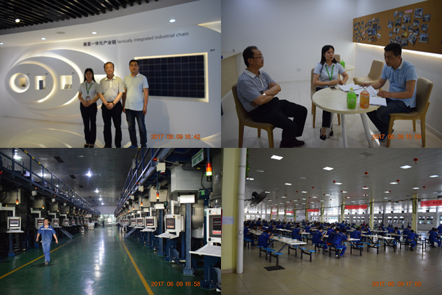晶科能源控股有限公司是全球?yàn)閿?shù)不多的擁有垂直一體化產(chǎn)業(yè)鏈的光伏制造企業(yè),業(yè)務(wù)涵蓋了優(yōu)質(zhì)的硅錠、硅片、電池片生產(chǎn)、高效單多晶光伏組件制造以及光伏電站建設(shè)等領(lǐng)域,是目前全球光伏組件生產(chǎn)的龍頭企業(yè),2016年中國500強(qiáng)企業(yè)。公司負(fù)責(zé)人帶領(lǐng)考察人員參觀了公司現(xiàn)代化的生產(chǎn)車、晶科商學(xué)院、員工宿舍和食堂,介紹了公司的發(fā)展情況和用人需求。在考察過程中,考察人員公司給學(xué)生提供的工作崗位、待遇、住宿、安全管理等情況與企業(yè)負(fù)責(zé)人進(jìn)行了深入交流。