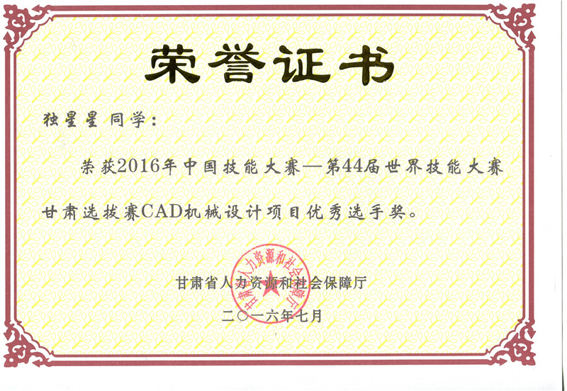 - 上一篇:第44屆世界技能大賽甘肅選拔賽焊接項(xiàng)目優(yōu)秀獎(jiǎng)[ 06-21 ]