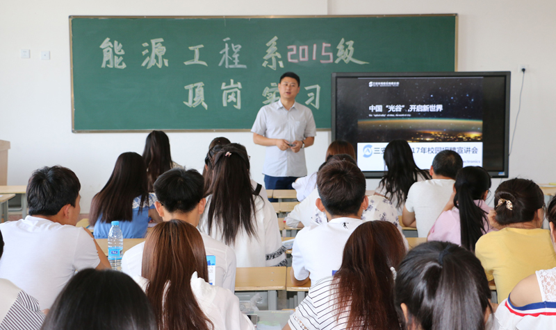 安徽三安光電有限公司在行樹樓504教室開展了頂崗實習宣講會,2015級農(nóng)村能源與環(huán)境技術大專班和2015級太陽能光熱技術及應用大專班學生參加了此次宣講會。李明經(jīng)理就企業(yè)概況、企業(yè)文化、崗位需求、薪酬待遇等方面向同學們做了介紹,并對有應聘意向的同學進行了面試,最終共有50人被安徽三安光電有限公司錄用。